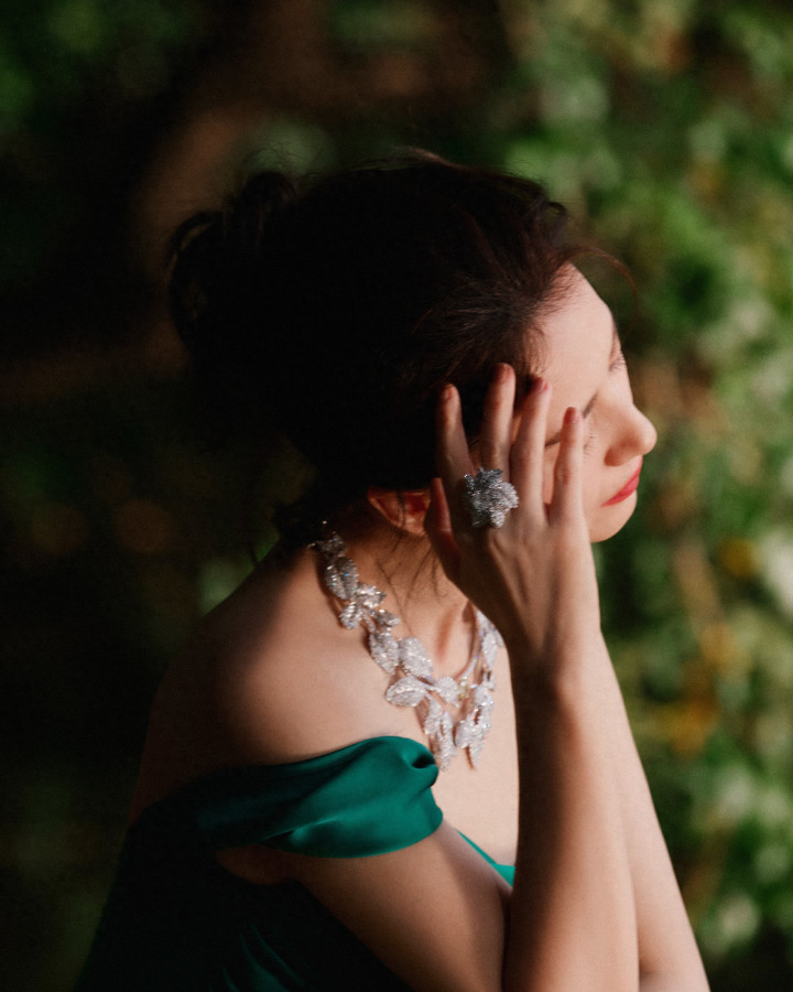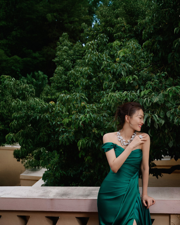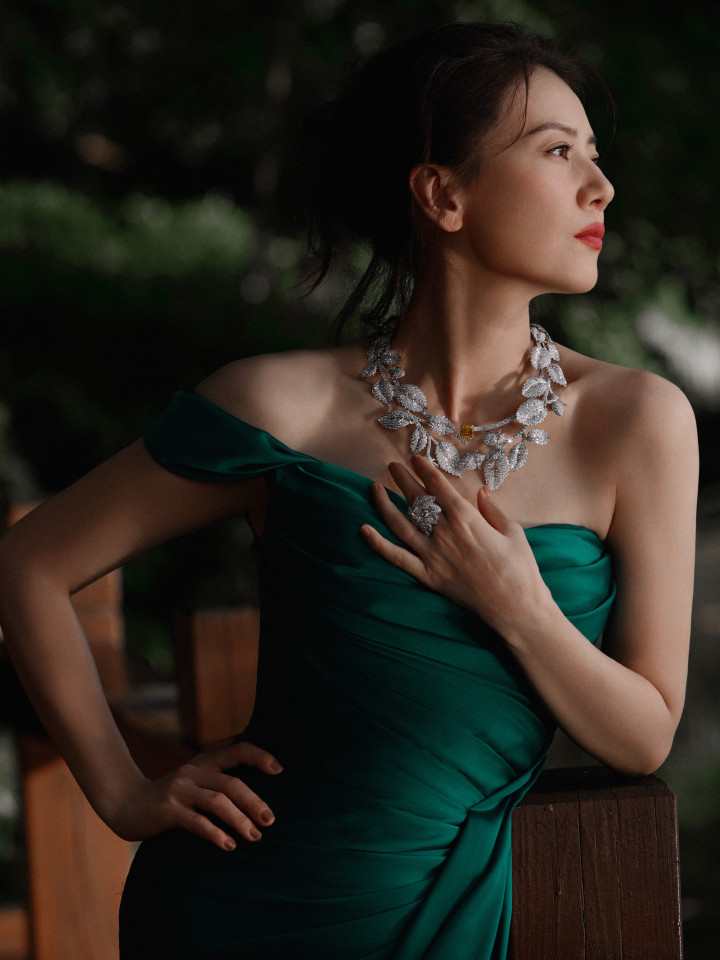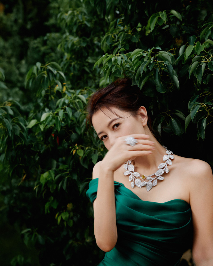 > 高圆圆翡翠绿抹胸礼裙