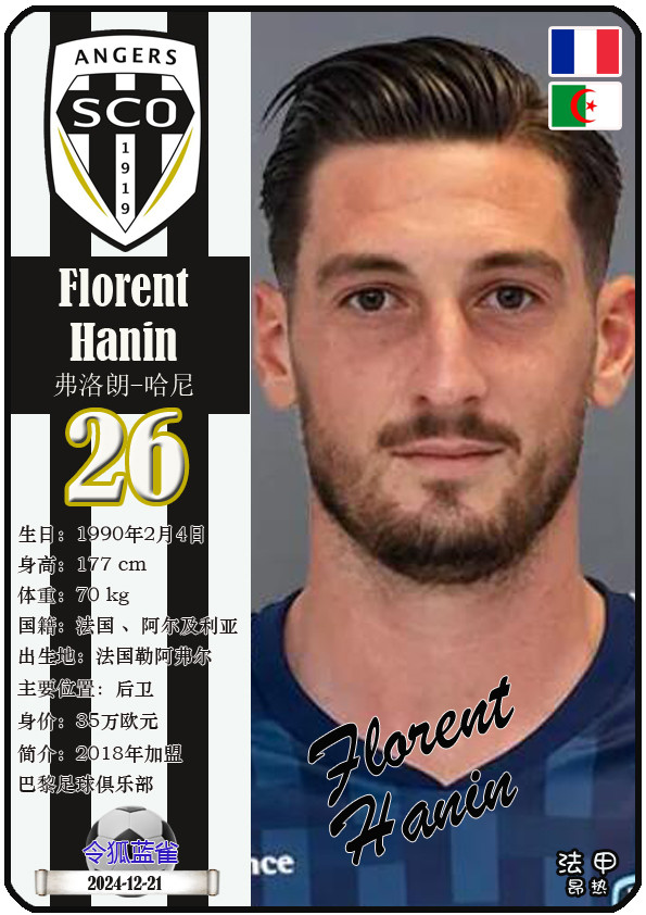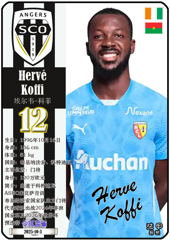 法甲昂热足球俱乐部成立于1919年10月19日,距今已有106年历史。截至2025年10月3日,球队主教练是亚历山大-杜热,队内拥有球员席马德-阿卜戴利、埃尔韦-科菲、皮埃里克-卡佩勒等。本期以球星卡的形式展示目前法甲昂热足球俱乐部的7名球员(按球衣号码排序):