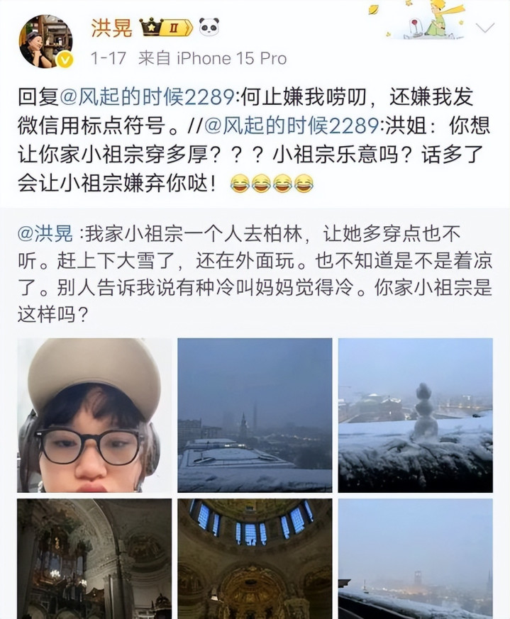 洪晃会向女儿吐槽工作上的烦心事,章冕也会跟她分享学校里的八卦。